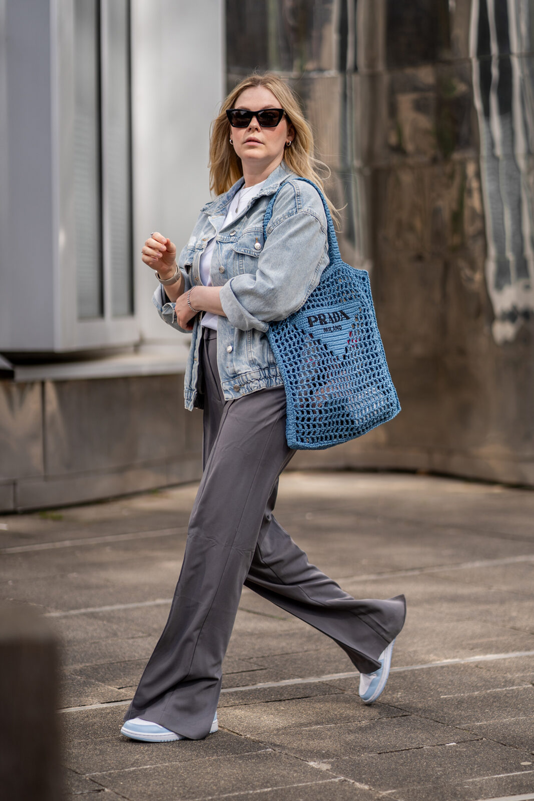Manchmal sind es die Accessoires, die einen ganzen Look definieren und genau so ist es bei diesem Outfit. Mein absolutes Herzstück? Die gehäkelte Tote Bag von Prada in einem strahlenden Himmelblau, das direkt nach Frühling und guter Laune schreit!
